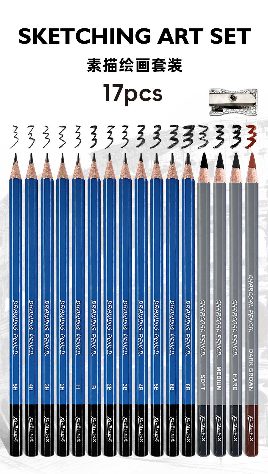 This 17-piece sketching pencil set is specially designed for artists, students, and beginners, aiming to provide them with a complete set of painting tools to meet all their painting needs.