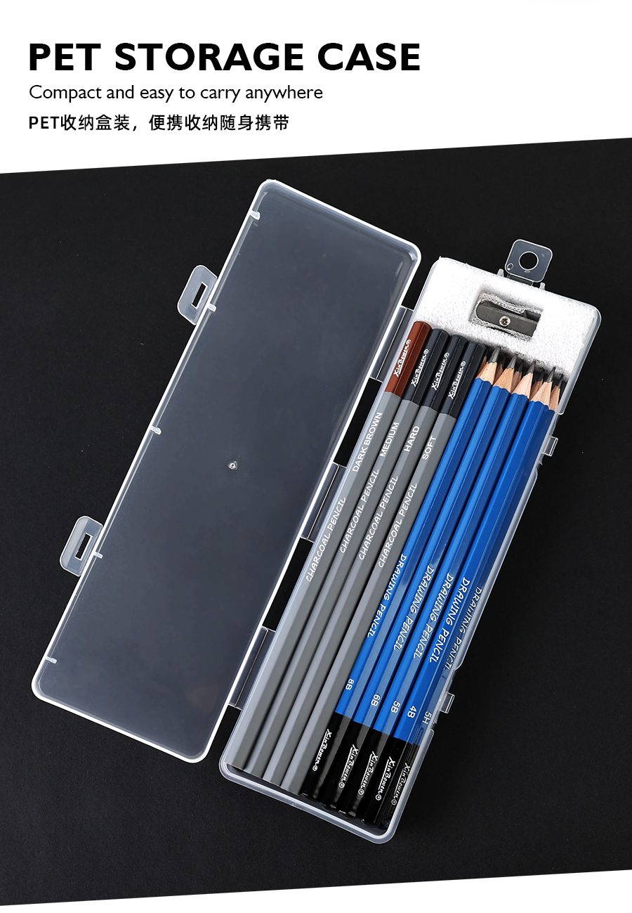 The tools include a full range of graphite pencils from 5H to 8B, enabling a natural transition from light sketching to dark shading. Additionally, the charcoal pencils (soft, medium, hard, and dark brown) can enhance the depth and artistic expression of the picture.