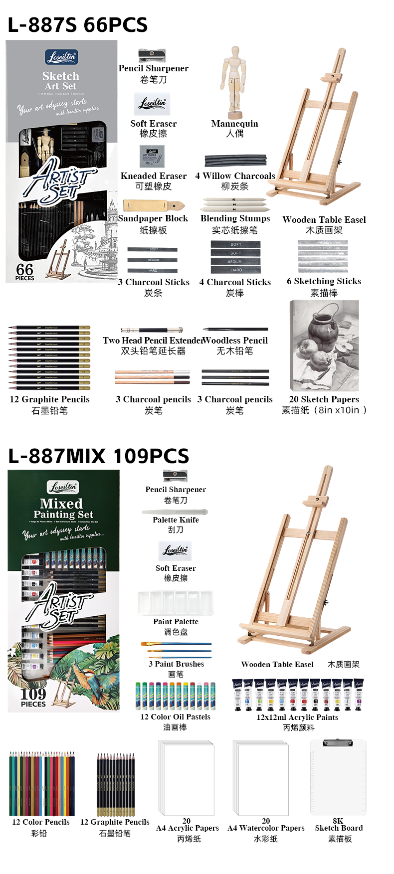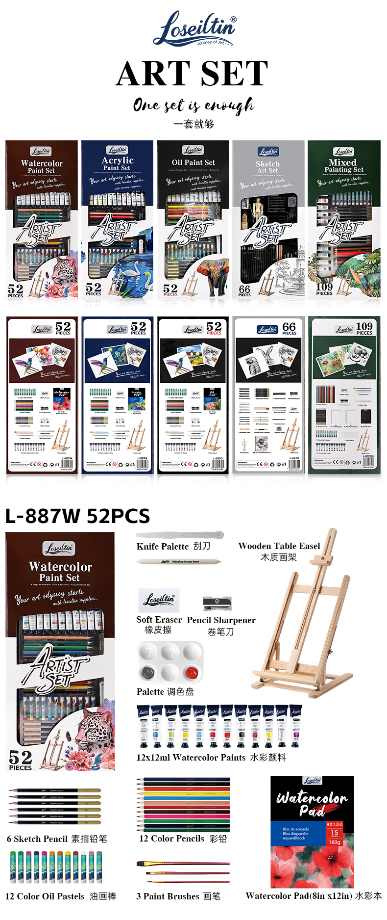 The Loseiltin L-887MIX 109PCS Mixed Painting Set is the ultimate all-in-one creative kit. With acrylic paints, watercolors, oil pastels, sketch pencils, colored pencils, brushes, canvases, and a wooden easel, this set lets artists experiment with all mediums in one box.