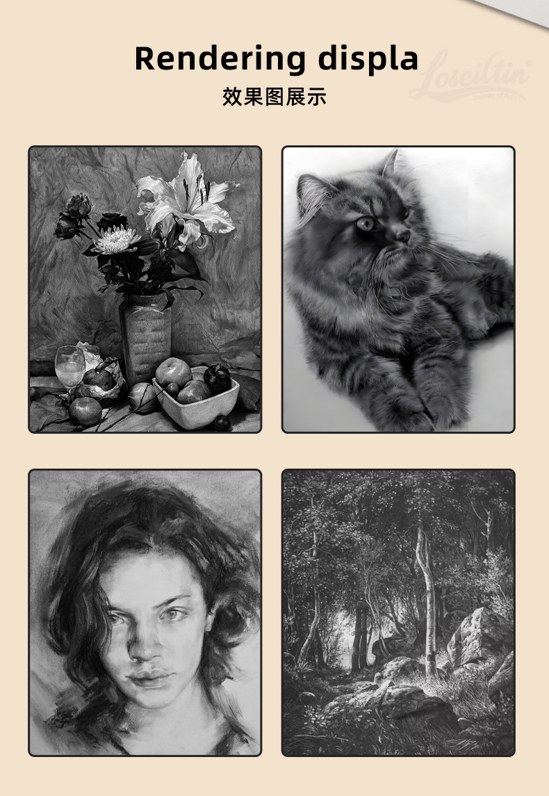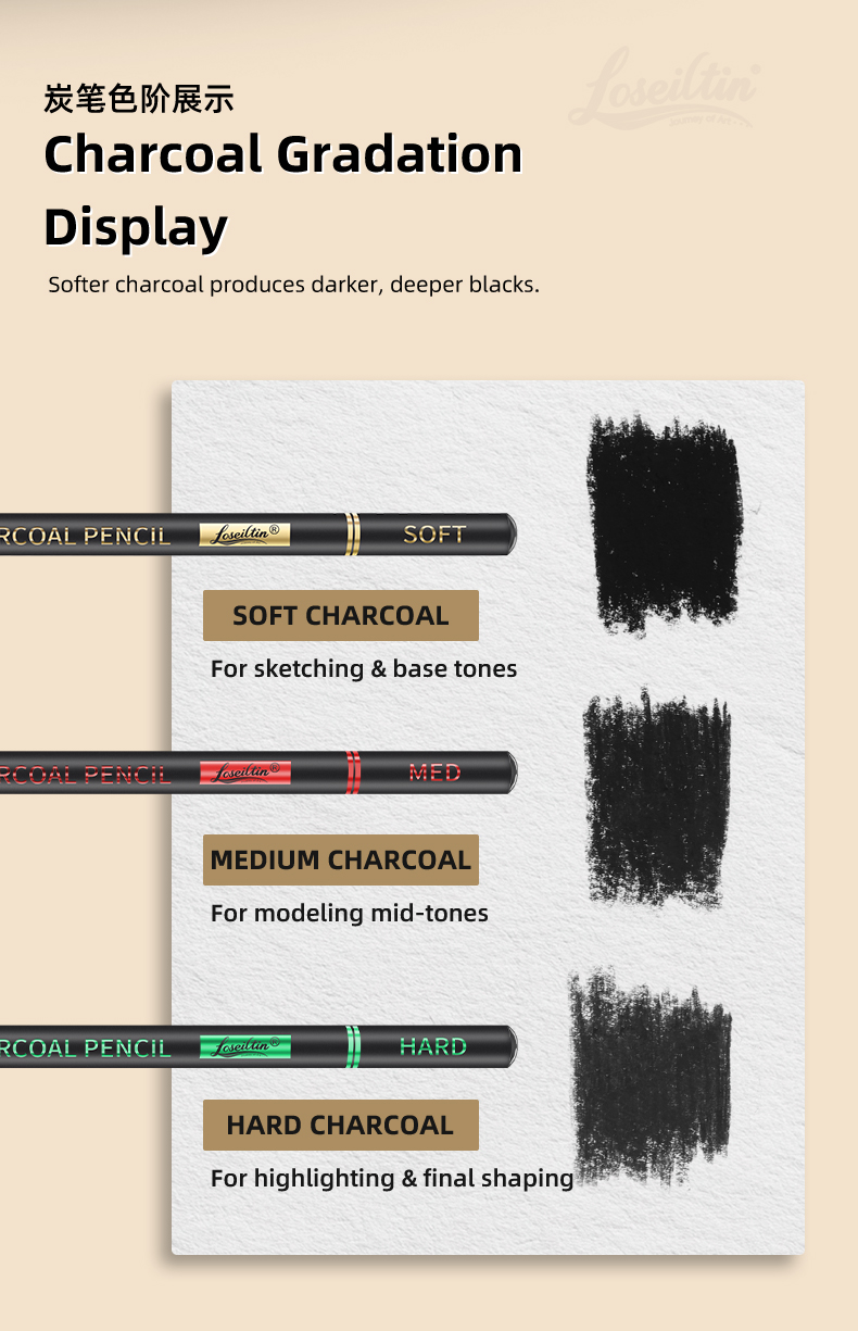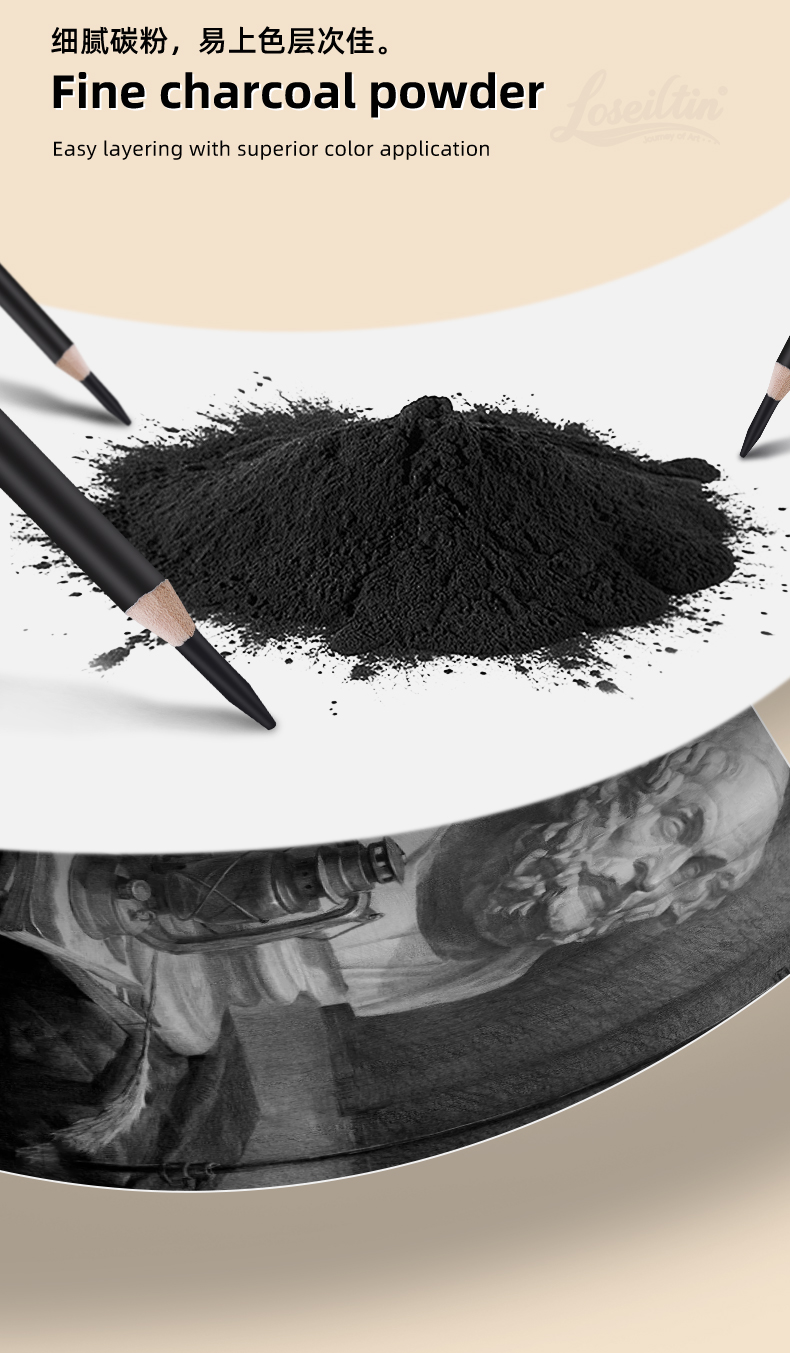 | SM032-1 | Soft | Loseiltin | 4mm charcoal + poplar wood | 12 pcs | 109g | 120 sets | 11.4×19.5 | 17.6cm × 0.72cm | Deep black, smooth shading | Portraits, shadows |