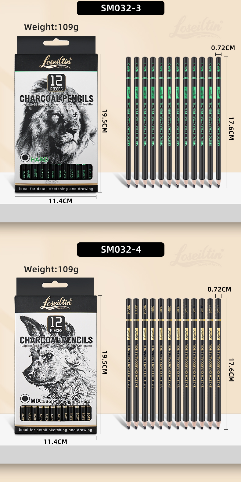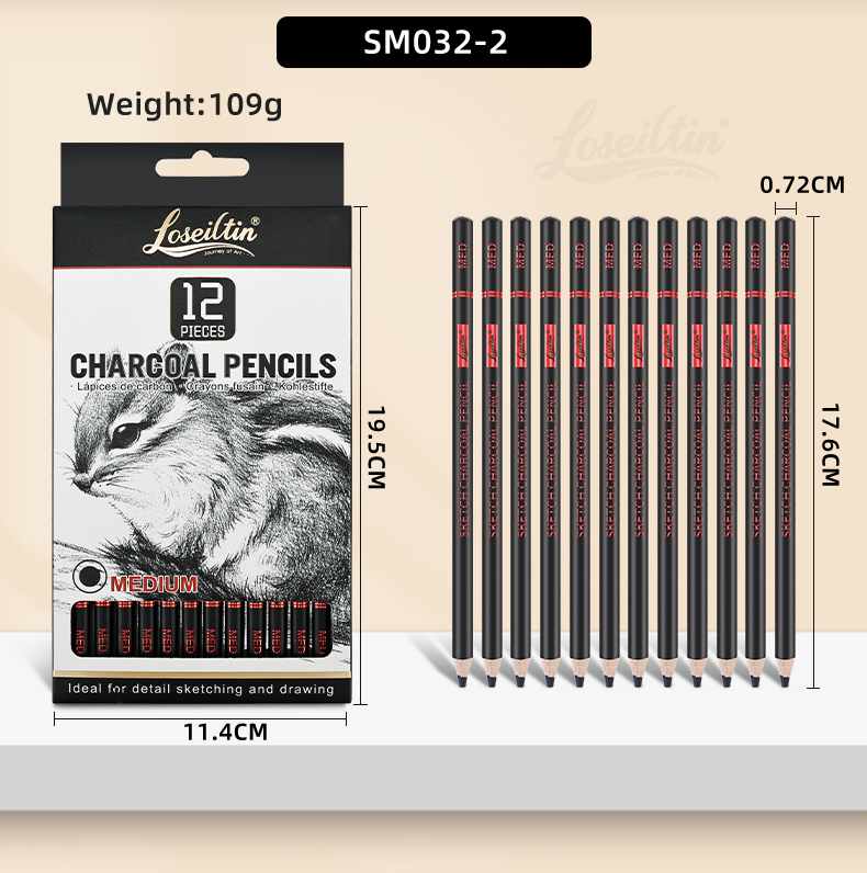 | SM032-2 | Medium | Loseiltin | 4mm charcoal + poplar wood | 12 pcs | 109g | 120 sets | 11.4×19.5 | 17.6cm × 0.72cm | Balanced hardness, versatile | Sketching, textures |