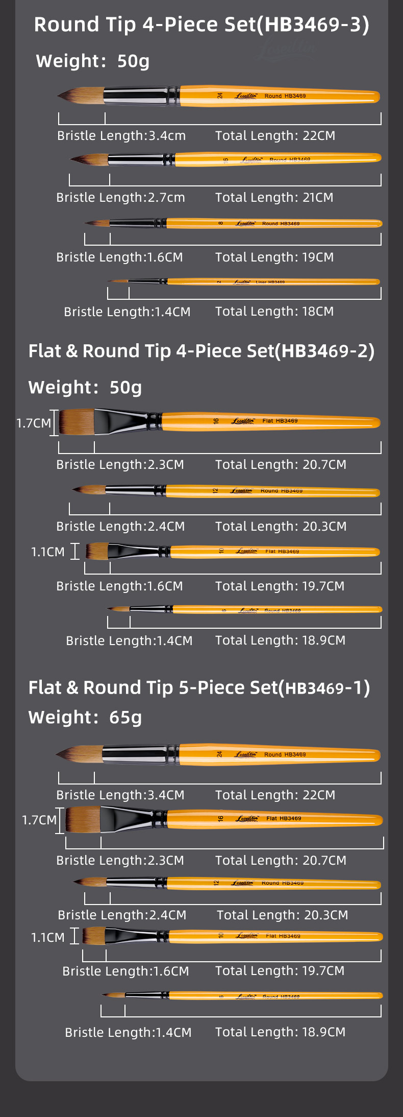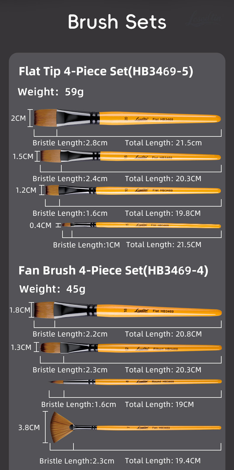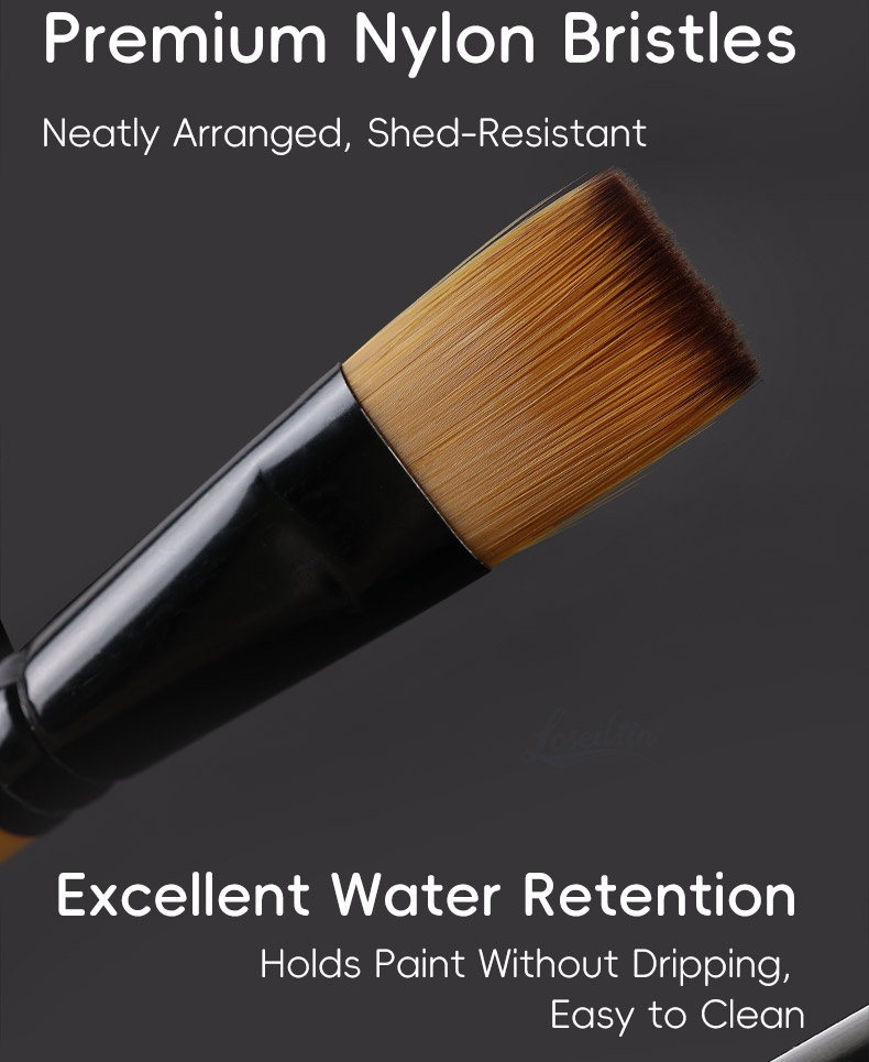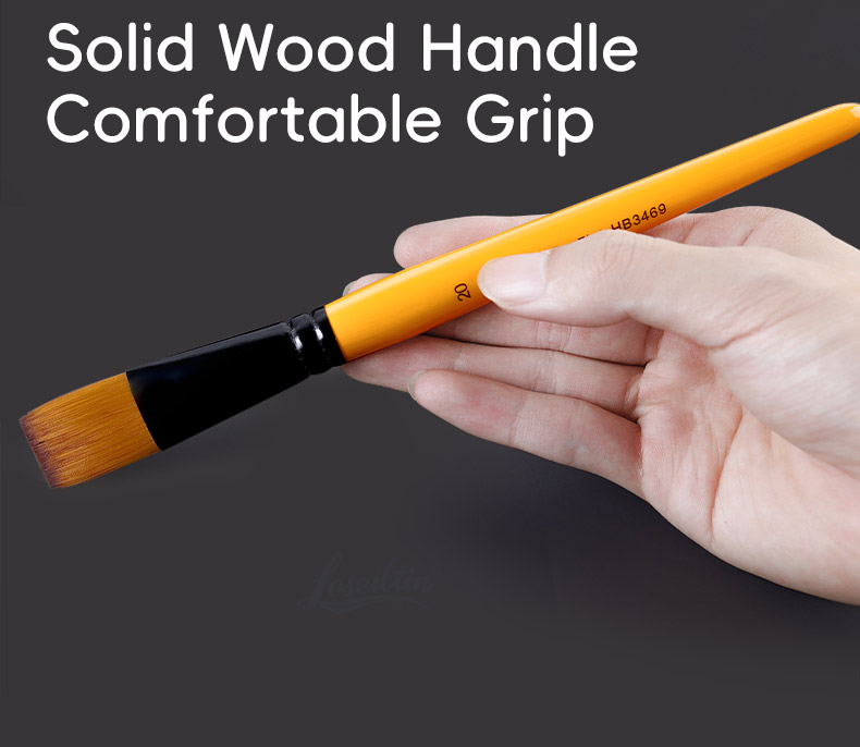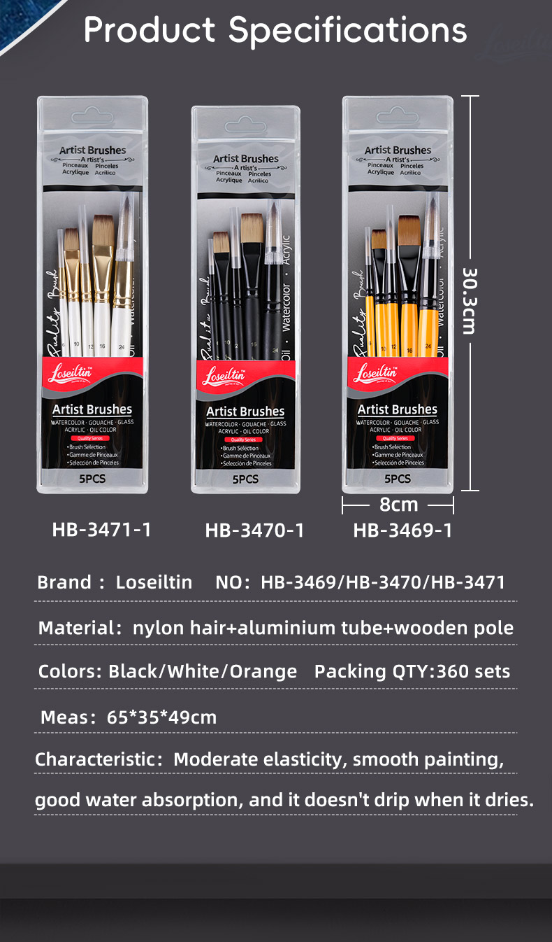The Loseiltin 5-Piece Artist Paint Brush Set (Models HB-3469 / HB-3470 / HB-3471) is crafted for both professionals and beginners seeking precision and durability. Each brush is made with premium nylon bristles that ensure smooth color flow and superior control. The aluminium ferrule prevents rust and bristle shedding, while the polished wooden handle provides comfort for extended use.
